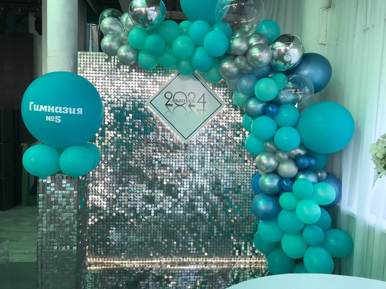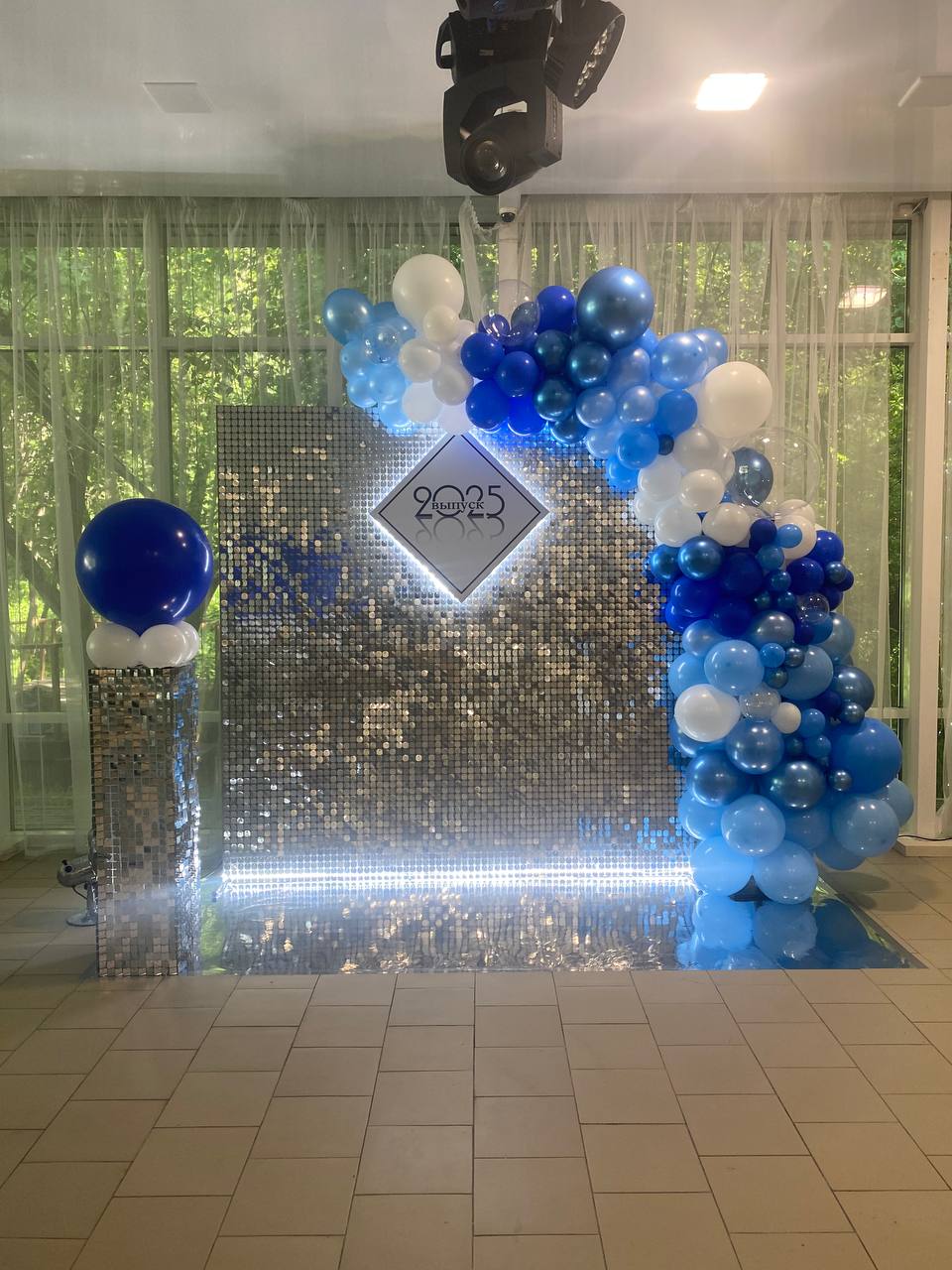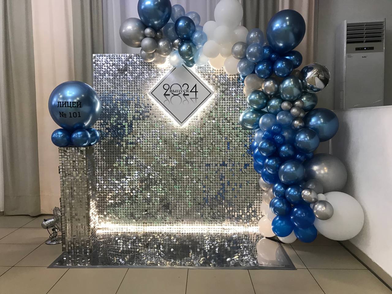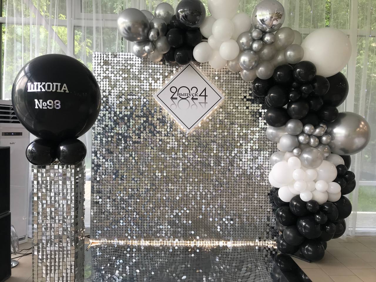 Шикарная полноценная фото зона из паеток (цвет паеток серебро, золото, черные), шары в разнокалибеной гирлянде могут быть того цвета, какой вам нравится.