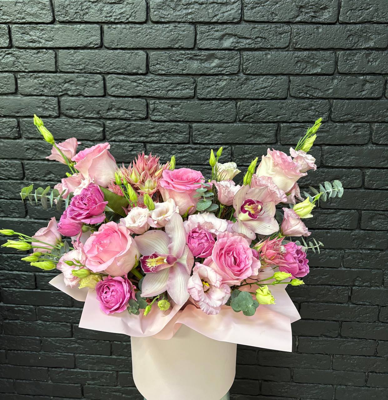 шикарная большая шляпная коробка с эустомой, пионовидной розой, орхидеей и эвкалиптом, никого не оставят равнодушным.
