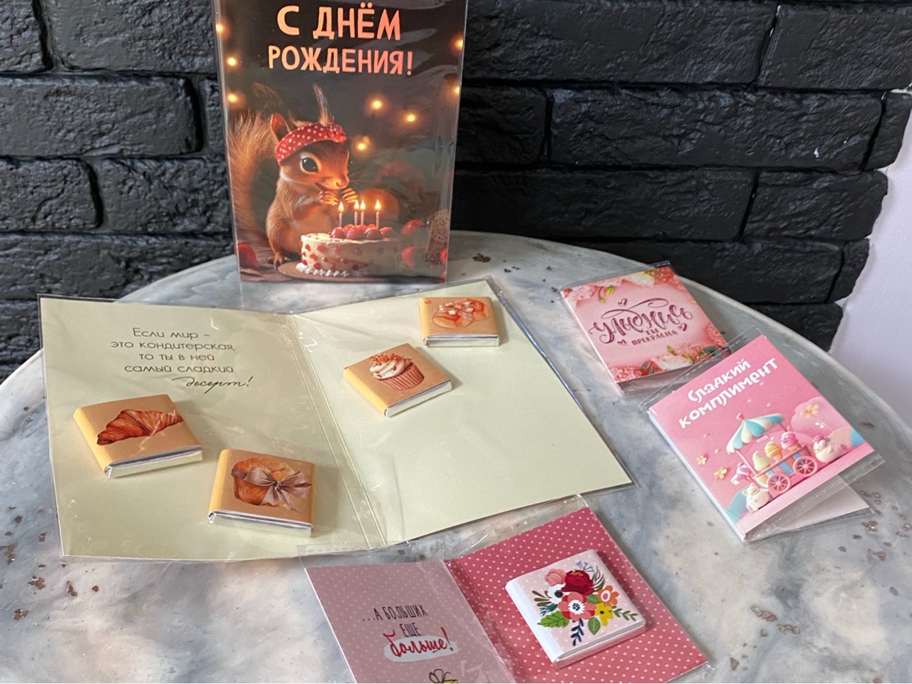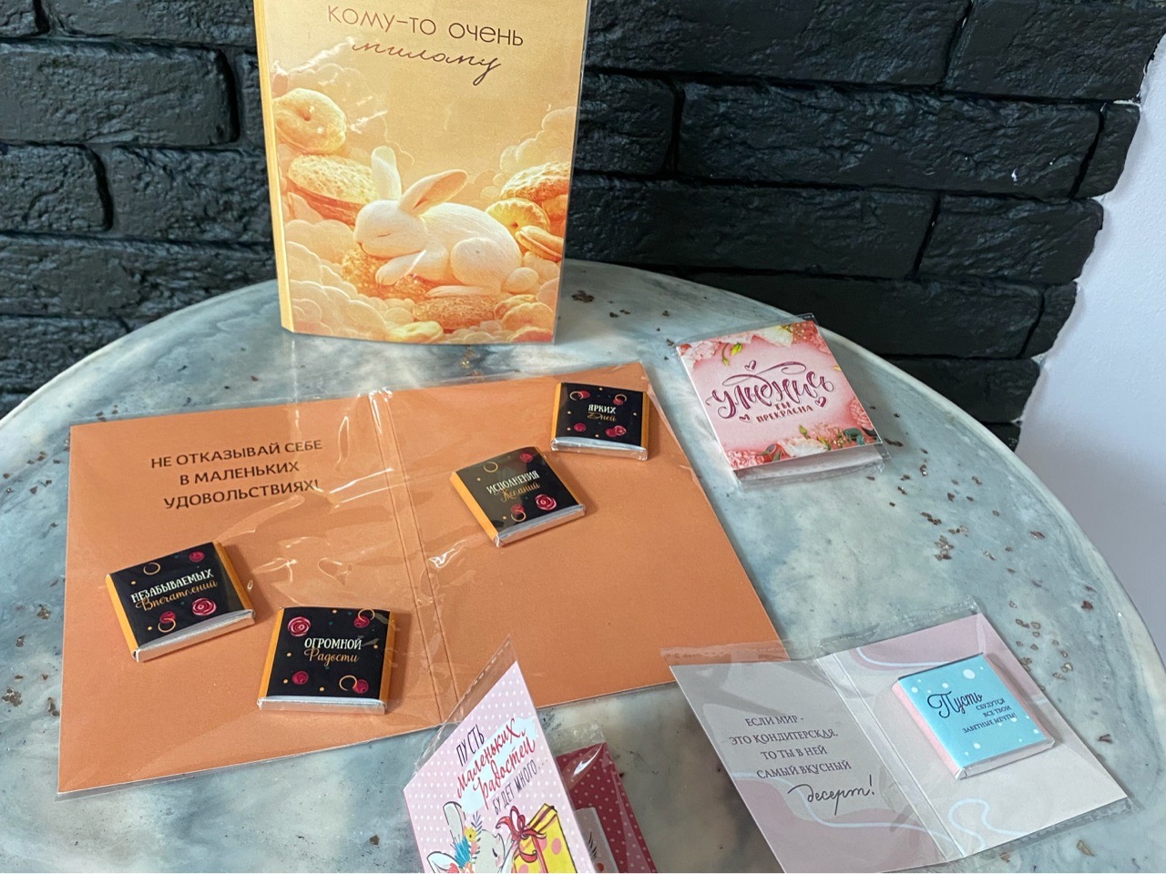 Ассортимент и тематика открыток разные. Наличие уточняйте у продавцов и консультантов. Цена открытки с одной шоколадкой 50₽, с двумя шоколадками 100), с четырьмя шоколадками 150₽